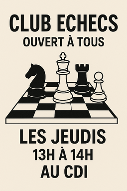 Pour les débutants et les initiés, le club échecs est l'occasion d'apprendre, de s'entraîner, de discuter stratégie et de jouer quelques parties dans le cadre d'un petit tournoi amical. Inscriptions ouvertes!