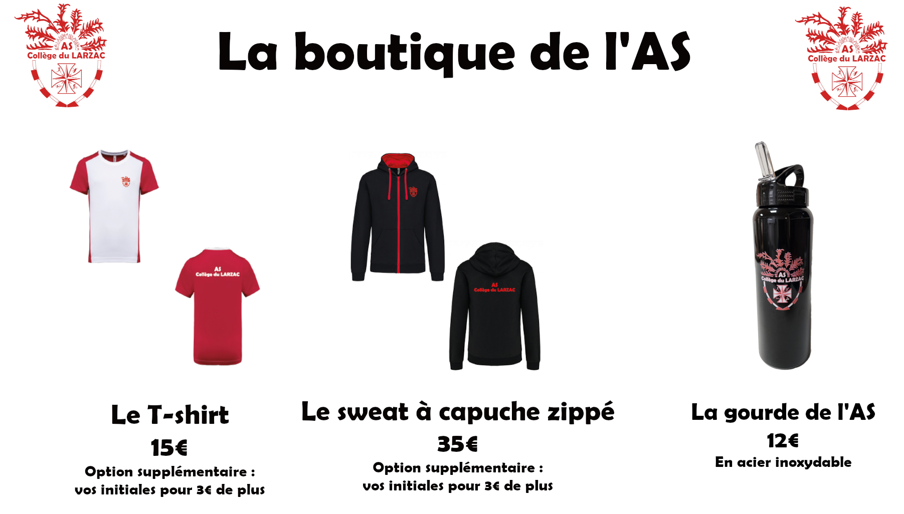 L'association sportive du collège réouvre sa boutique avec des nouveautés cette année. Un nouveau T-shirt, un sweat zippé et une gourde!